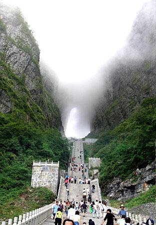 選擇乘索道游覽天門山是最佳視角。索道吊廂一出站房,馬上就騰空飛了起來,從城市的一棟棟樓頂掠過,猶如在城市上空滑翔。翻過一道山梁之后,城市被遠(yuǎn)遠(yuǎn)拋在了視線以外,大片翠綠的稻田映入眼簾,透過打開的通風(fēng)窗口,一陣陣青草水田特有的清香沁入心脾;蚋呋虻偷霓r(nóng)舍不時從我們身下滑過,牛羊們?nèi)齼蓛捎崎e的在田間浮動著,靜謐、安詳。再翻過一座山峰,我們便立即被滿山的青翠所包圍,萬仞絕壁也已投懷送抱。索道支架矗立于絕壁天險中,或挺立或傾倒或探頭或擁抱,我們繼續(xù)在艱險中游歷,時而隱沒于云堆,時而出世于蒼穹。這時你除了那滿懷的驚險刺激外有的便只有望索而興嘆了。我拍了很多片子,但是總覺得還是沒有足以記錄下來這座空中盆景的壯麗。