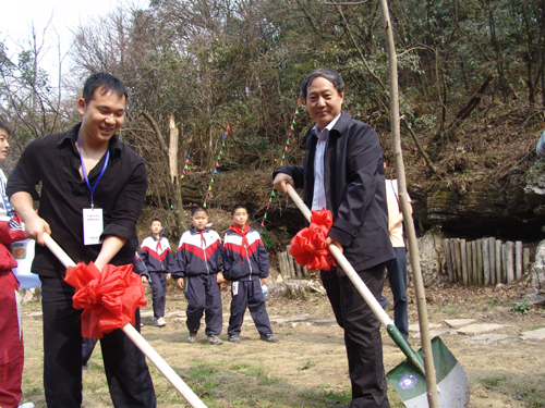 天門山公司董事長張同生與奧運冠軍樂茂盛一起為天門山再添新綠