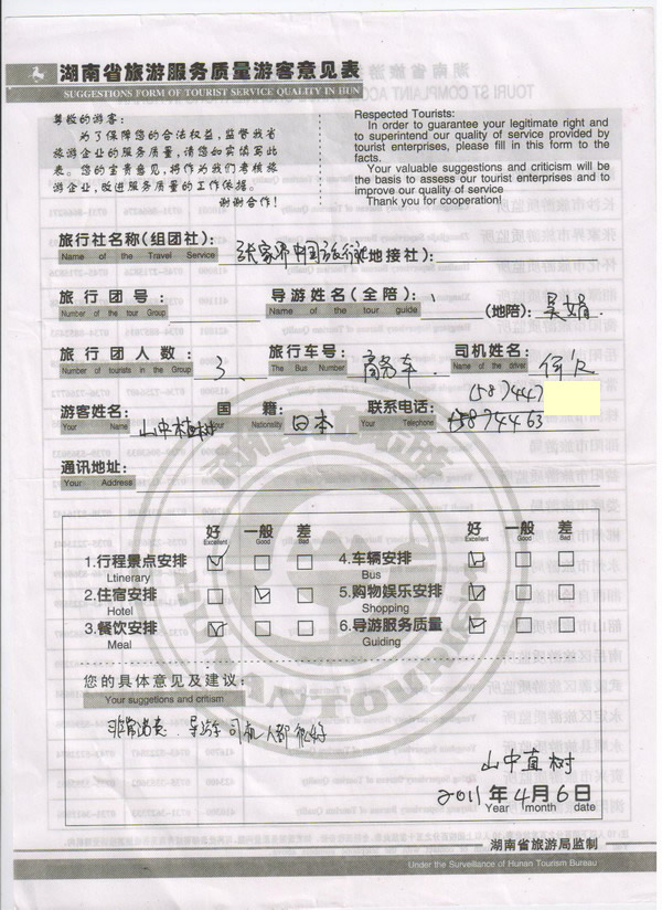 日本山中先生一行3人旅游質(zhì)量回饋:非常滿意,導(dǎo)游司機(jī)人都很好!