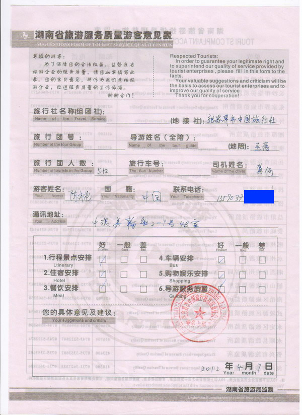 香港陳先生一行7人旅游質(zhì)量回饋