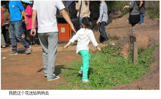 當(dāng)看到路旁的各種野花時(shí),這位小女孩又突發(fā)奇想:“爸爸,等等我,我給媽媽送朵花!薄安灰S便摘花哦!痹捯粑绰,女兒卻早已將野花摘在手上。等趕到媽媽將花送給媽媽時(shí),媽媽的臉上洋溢著的是滿滿的欣慰與幸福,“來(lái)我給你插上!眿寢寣⑿∫盎ú逶诹诵∨⒌念^上。