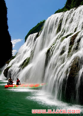 [水洞子瀑布]而鬼門關的急浪更帶著幾分野氣,它是整條漂流線中最大落差的一個,同時也是最富有刺激的一段,和游人游性的情緒高漲的時刻,在有驚無險的情況之下,載著滿船的浪花闖過去。闖過鬼門關我們就可以觀水洞子瀑布了,水洞子瀑布是地下水叢石壁上一個大溶洞中流出,高約70米,寬約45米,它妙在既不循岸而落,也非一瀉而注而是先順崖隙而出,時開時合,好似碎玉遍山,又如摧冰下滑。從懸崖上跌落下瀉,乘船近瀑布,又覺水從天降,那跌沖崖臺的如練垂瓊座,直落碧潭的似玉結帷簾,飄浮船中的若裙帶輕逸,水洞子瀑布既有高山流水之雅,又有飛瀉直落之雄,過水洞子瀑布到繞瀾灘頭,這繞瀾子的名字,是因為石岸的神蛙石到南巖一帶的懸崖,很像秦皇所建的長城吧。在長城的下面圍繞著一條瓊練的玉帶,故稱繞瀾,但繞瀾的浪濤也有著不同別的灘,灘下的淺潭,清澈迷人,峭壁屏立,引人嘆奇,經陰陽潭、黃土角等大小五道灘,便來到阻舟河,兩岸青峰陳列,使人聯(lián)想到小三峽的景色,而且三峽之處,就是滿山的翠葉隨著季節(jié)的變遷,時而綠如菌,時而紅似火。靠右岸峰頂有一組造型別致的巖石,他們如筆如柱,如猴如僧,很像是“西游記”中的唐三藏他們師徒四人正向西天出發(fā)呢! |