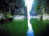 [猴兒跳]位于牛路河段,兩岸千丈,懸崖緊挨,乘船河中仰望僅見(jiàn)一線之天.從此岸到彼岸,猴兒可自由自在跳來(lái)跳去,故名曰“猴兒跳”。
