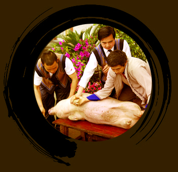 | 把日子選好后,接著就是請(qǐng)屠夫了,屠夫便要安排殺豬的時(shí)間,同時(shí)要主戶家燒一大鍋滾燙的開水準(zhǔn)備著,還要請(qǐng)一兩個(gè)有力的男人幫忙,叫做“扶扎”。屠夫進(jìn)門后,準(zhǔn)備好大木凳、大木盆(又稱澡盆)、刀、刨、釕環(huán)等器具,再把要?dú)⒌哪曦i趕出豬欄,男人們將年豬捉住按倒在木凳上,屠夫用清水洗凈年豬的咽喉處(是為了豬血的干凈)。屠夫手握殺豬刀快速準(zhǔn)確地刺入年豬的咽喉處,年豬幾聲嚎叫,拼命掙扎一番后就慢慢沒了氣息。因此,農(nóng)村有句歇后語叫做“殺豬殺屁股———各是各的刀法”(比喻做事情各自方法不同),也由此而來,當(dāng)然,殺豬的屁股是很難將豬殺死的。 據(jù)說有道行或有經(jīng)驗(yàn)的屠夫,可以根據(jù)年豬的血狀來斷定來年主戶家的禍福吉兇、財(cái)運(yùn)年成等,如宰殺的年豬血很少或無血,則預(yù)示著主戶家來年的財(cái)運(yùn)差,甚至要破財(cái);如豬血噴射較遠(yuǎn)且成火焰狀,則預(yù)示著來年主戶家應(yīng)防火災(zāi)或血光之災(zāi);如豬血暢旺且很有規(guī)律,血色鮮艷且多,無異狀,則預(yù)示著來年主戶家財(cái)運(yùn)好,收成好無災(zāi)難。 另外,殺年豬時(shí)主戶家的主婦是不能到場(chǎng)壩看殺豬的,說是看了殺豬后來年就喂不好豬(稱為“不來豬”)。其主要原因可能是不忍心看宰殺年豬的場(chǎng)面,畢竟自己喂養(yǎng)的牲畜,朝夕相處,多少都有點(diǎn)感情罷了。 年豬殺死后,主戶家的婦女們就要端走豬血盆,灑上食鹽,讓其凝固,做成豬血豆腐。婦女們便忙著做飯燒菜,準(zhǔn)備招待接來吃“刨湯”的客人及屠夫,來吃“刨湯”的大多是女兒、女婿和摯友鄰居等;男人們就忙著刨毛清臟,屠夫則將年豬掛上釕環(huán)(專門掛豬肉的工具)后,把豬肉分成大小不等的肉塊,這時(shí)屠夫的工作就算完成了。將豬肉腌制上炕大多是婦女們的事,因?yàn)橛檬雏}腌肉打“紅鍋”有一套很繁雜的工序,腌制上炕后,經(jīng)過一段時(shí)間的煙熏烘烤便成了有名的“土家臘豬肉”了。最后就是吃飯喝酒,先把屠夫請(qǐng)到上席入座,再把吃“刨湯”的客人按輩分高低分別安排落座后,由主戶家男人(稱為當(dāng)家人)熱壺酌酒,婦女們就忙前跑后,端菜盛飯,熱情款待客人,客們則一邊吃喝,一邊聊家常,其樂融融。 | |||||
