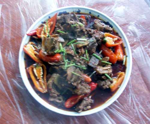 血粑鴨子是鳳凰最具特色的地方菜之一,制作時將預先浸泡好的上等糯米裝入碗里,宰殺鴨子時將鴨血溶入糯米浸泡均勻。等鴨血凝固了,再蒸熟,放冷后,將血粑切成一小塊小塊的方塊,然后用菜油煎熟。待鴨肉煮九分熟時,再將血粑放入鴨肉里烹煮,并摻合一定的香料物品,成金黃色即可,鴨子煮血粑既有鴨肉的鮮美味濃,又有血粑的清香糯柔,吃起來口感香濃,食欲大增,真是稀有的人間美味佳肴。