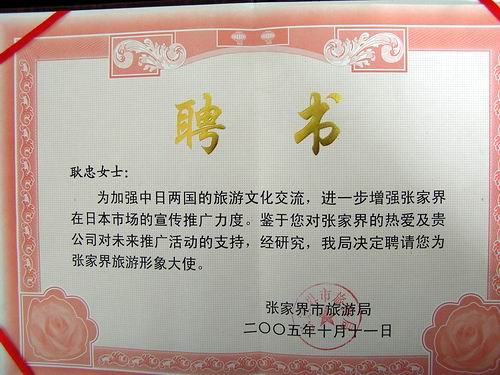 耿忠被聘為張家界市旅游形象大使后,她將在日本對張家界的旅游形象進行推介、宣傳,組織日本旅游團隊來張家界旅游、考察。