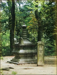 在愛(ài)晚亭后右方不遠(yuǎn)的密林中。過(guò)了楓林橋,便能見(jiàn)到一座