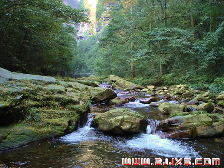 腳面,因流經(jīng)一座金鞭巖而得名。其出張家界數(shù)十公里,過(guò)索溪峪而匯入澧水,成為數(shù)百里外洞庭湖的一條源頭之流。金鞭溪在兩峽之間左右盤繞而去,一條青石古道順流而下,沿途林木掩映,峰回水轉(zhuǎn),倒是十分幽靜清涼,登山之后那種煩躁感如一浴清流而蕩然無(wú)存。