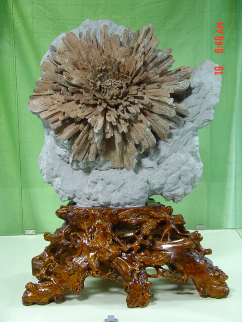 菊花石的發(fā)現(xiàn)和加工大約在清乾。1736-1795)年間。有人在永和鎮(zhèn)側(cè)的河床中發(fā)現(xiàn)了這種奇特的石頭后,便碾傳傳到一個叫歐陽錫藩的秀才手中。歐陽秀才平日擅長雕刻,見石如獲寶,拿回家中,細細揣摩,依照花形,精心雕琢。不久,一個高雅別致的菊花石硯出現(xiàn)在客廳,引來各路文人墨客觀賞。清《瀏陽縣志》載:"菊花石堪稱菊石花,在縣東永和鎮(zhèn)側(cè),大溪水過永和市,中流石亙?nèi)缰,無甚花卉,一望如漩渦堆積凹凸萬狀,如鏤如封,色蒼然可愛,有紋而晶瑩,作菊花狀,跗萼宛然。其中式含苞半吐,殊極有趣。每秋高水落,益玲瓏可喜。"