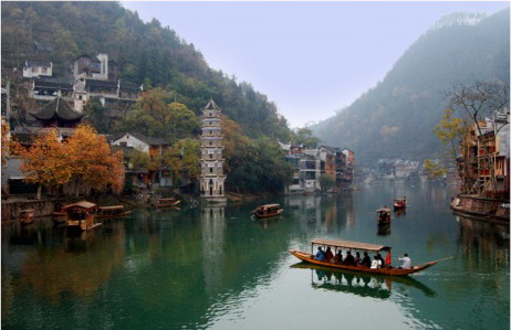 沱江河是古城鳳凰的母親河,她依著城墻緩緩流淌,世世代代哺育著古城兒女。坐上烏蓬船,聽著艄公的號子,看著兩岸已有百年歷史的土家吊腳樓,別有一番韻味。順水而下,穿過虹橋一幅江南水鄉(xiāng)的畫卷便展現(xiàn)于眼前:萬壽宮、萬名塔、奪翠樓……一種遠離塵世的感覺悠然而生。