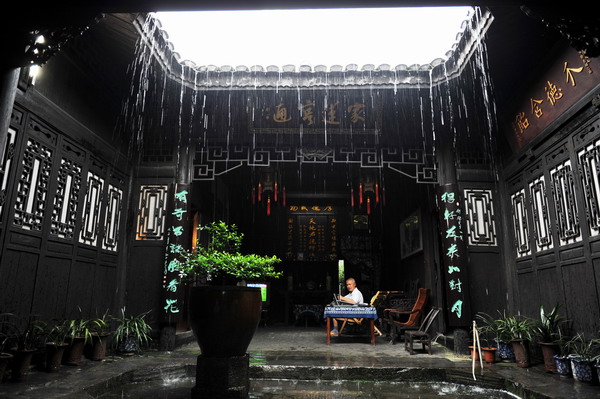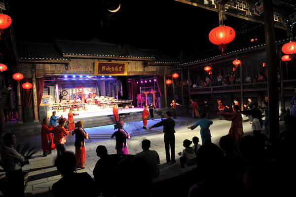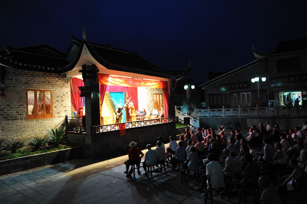 沒走幾步,一支帶著童音的歌聲,從一座木板庭院里傳出,幽雅,張揚,我們循聲走進這棟老屋,庭院里居然是一處表演場,一個小姑娘握著話筒在舞臺上一邊歌唱,一邊表演。這邊觀眾臺前端莊地坐著幾位帶有藝術(shù)氣質(zhì)的中年人,他們在細語,像是在評判著那個姑娘的姿態(tài)和演唱。