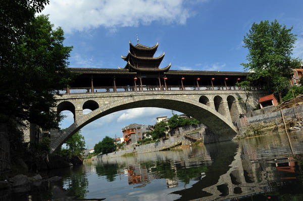 我們順著江岸上行,遠遠地看見一座飛架東西的石拱橋橫跨江岸。那定是傳說中的三王閣風雨橋了。盡管我難以尋找那些傳說中的故事,但是,我知道,這座風雨橋見證古城的滄桑變化。