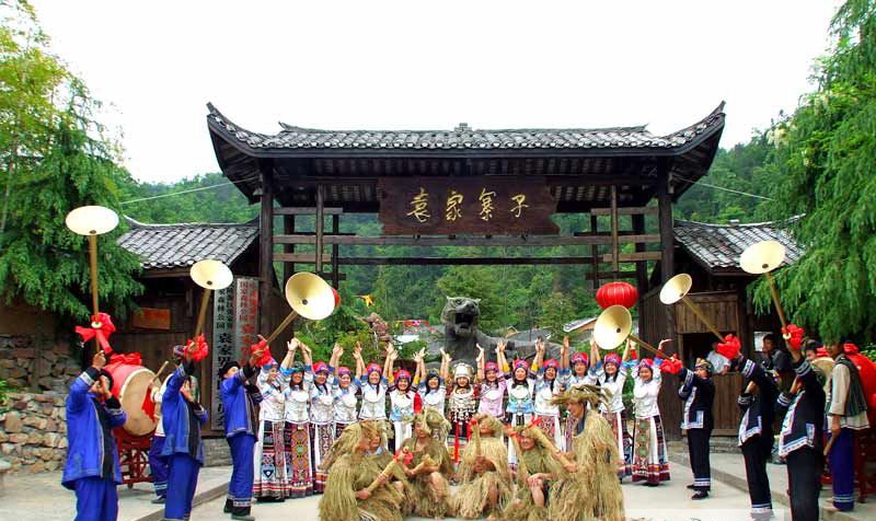 在張家界264平方公里石英砂巖絕壁頂上、3103根神秘山峰之巔至今唯一保存著一座土家山寨----袁家寨子。這里居住著一群喝虎乳長大的土家后裔,他們至今還沿襲200年前的后產(chǎn)、生活方式。這座寨子構(gòu)建獨特,是按照動物形體建造的仿生建筑。寨民靠耕種“空中田園”為計,為游人現(xiàn)場表演碾、榨、磨、碓、織等原始傳統(tǒng)手藝;通過唱、跳、哭、咒、符等另類的習(xí)俗和神秘的信仰,演繹著高山土著民的“人、神、情”秘訣。